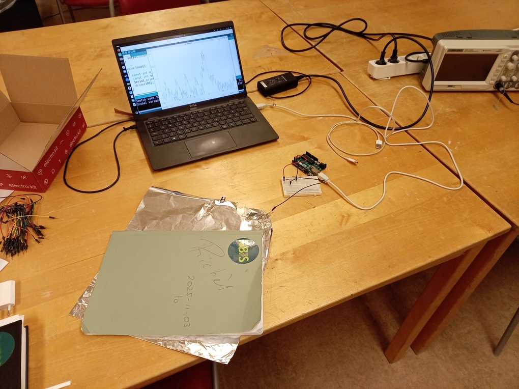 - Lägga till en lysdiod. Skriv kod som gör något med den kapacitativa sensorn. Det behöver inte vara för tufft, t.ex. att lysdiod brinner 5 sekunder efter en person har nått sig.