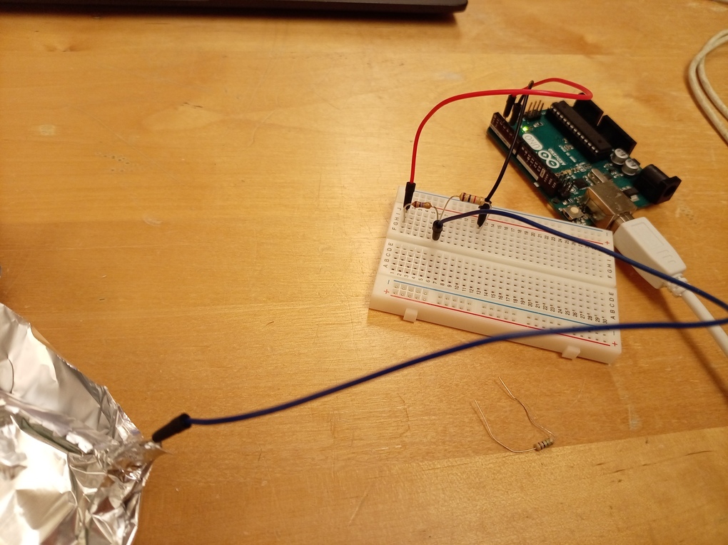 Koppla ett Arduino till två motstånd. Motständerna måste var 1 million Ohm (1 MOhm) och 1 tusen Ohm (1 kOhm).